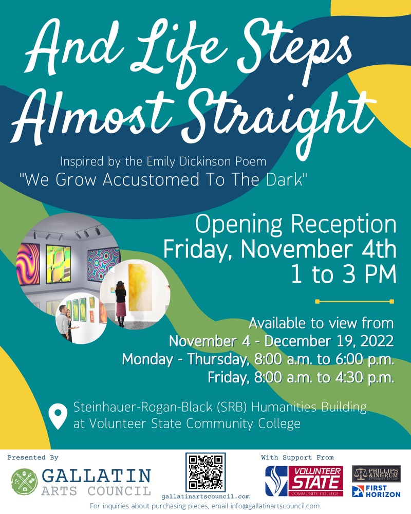 The Gallatin Arts Council is pleased to present this year’s juried art show, “And Life Steps Almost Straight,” in partnership with Volunteer State Community College. The opening reception will take place on Friday, November 4th from 1 to 3 p.m. at the Steinhauer-Rogan-Black (SRB) Humanities Building at Volunteer State Community College.