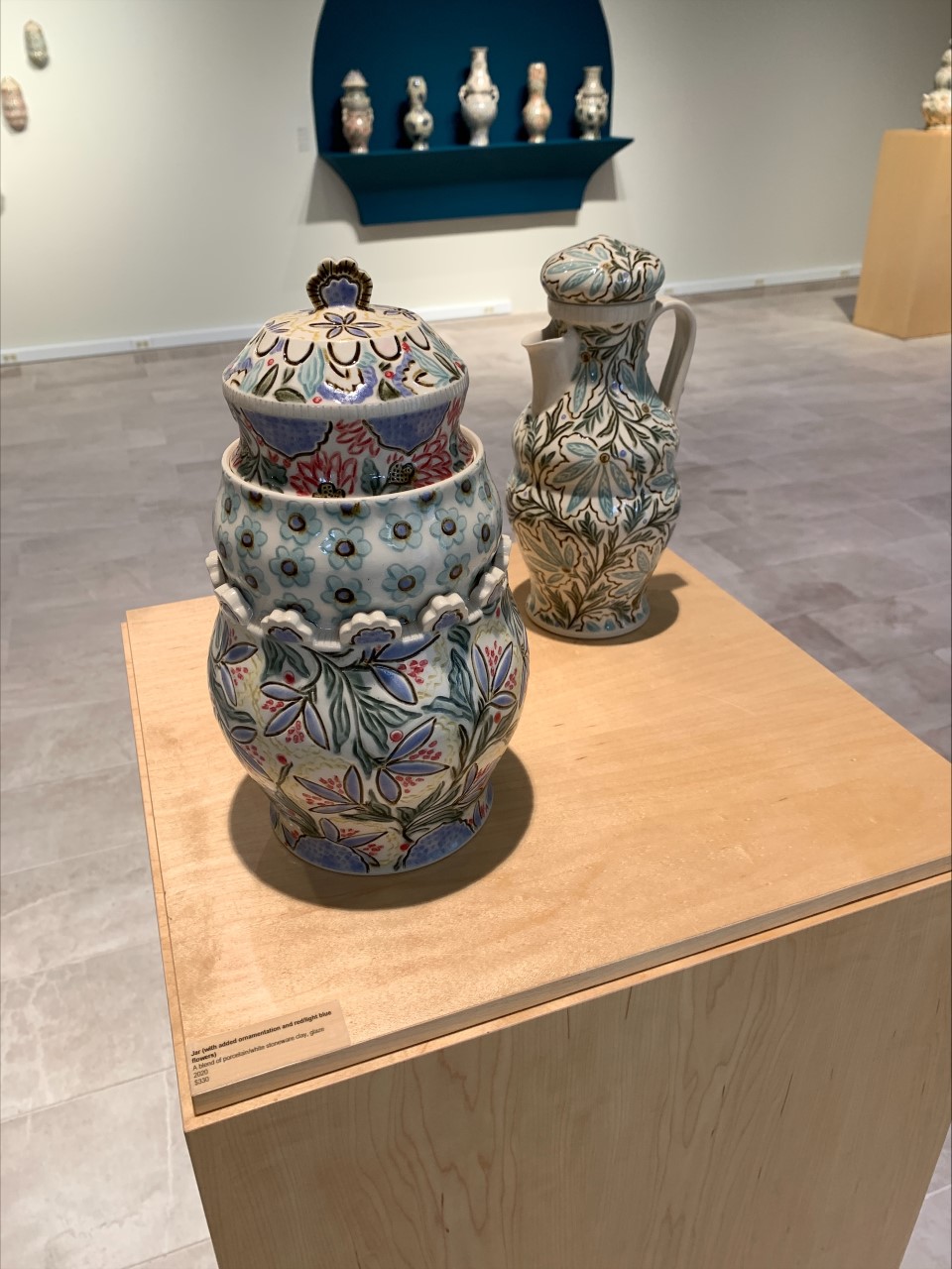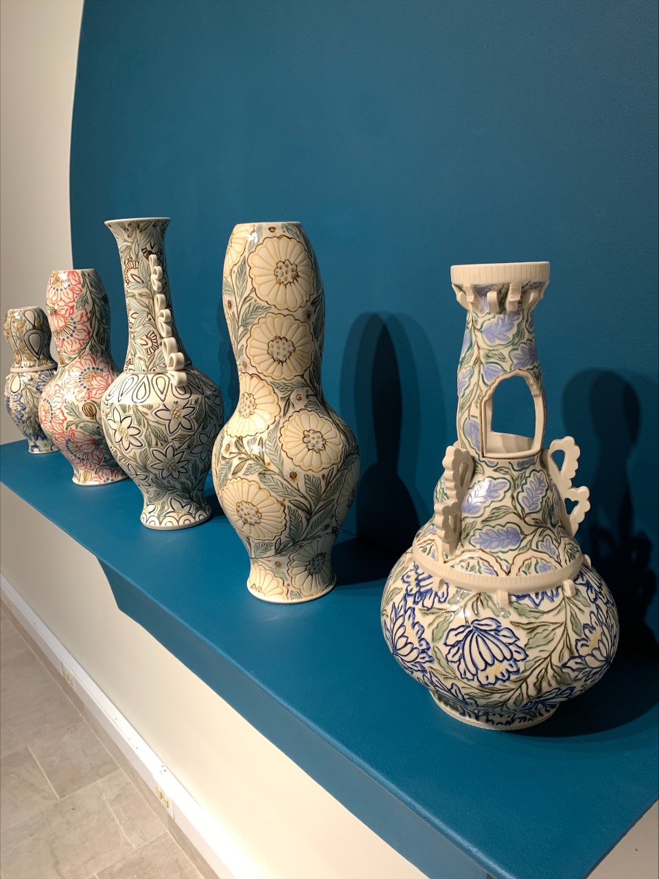 Over the past few years, Audry has been studying different botanical symbols seen throughout history. In her own interpretation, she carves these symbols into white clay to create beautiful ornate vessels, which are featured in this art exhibit.