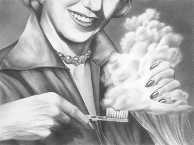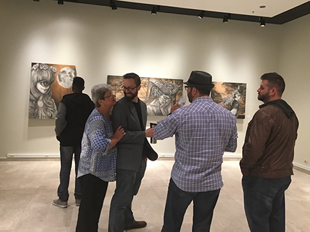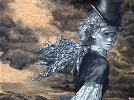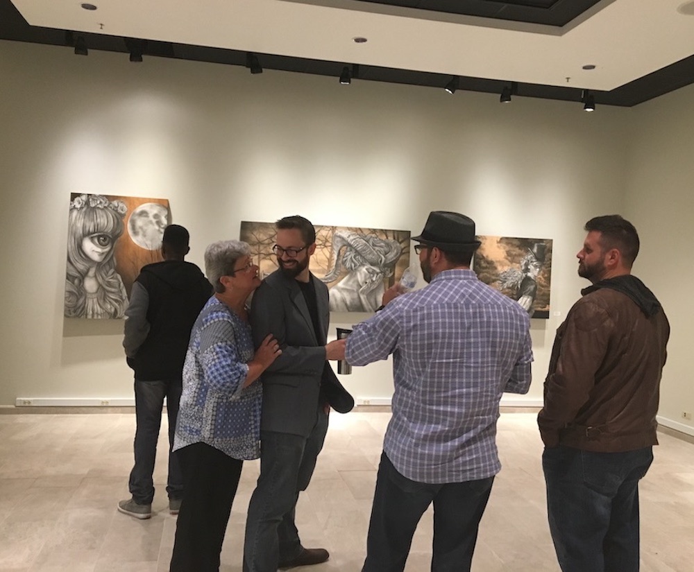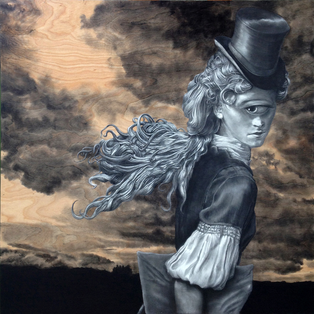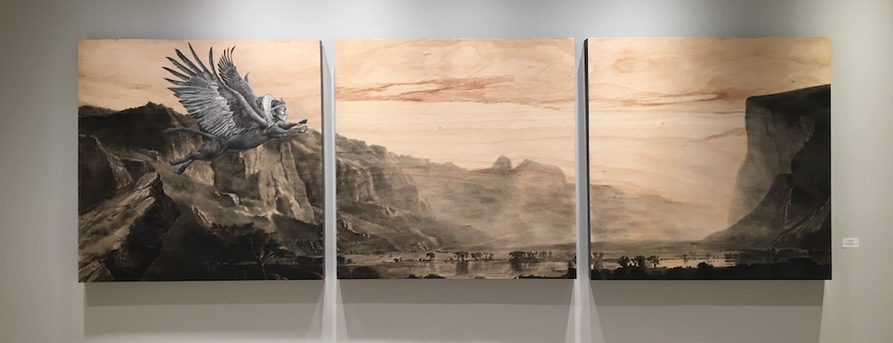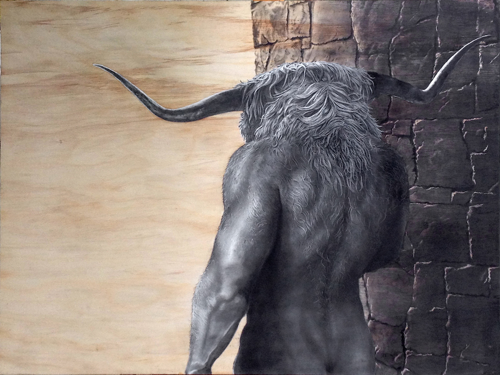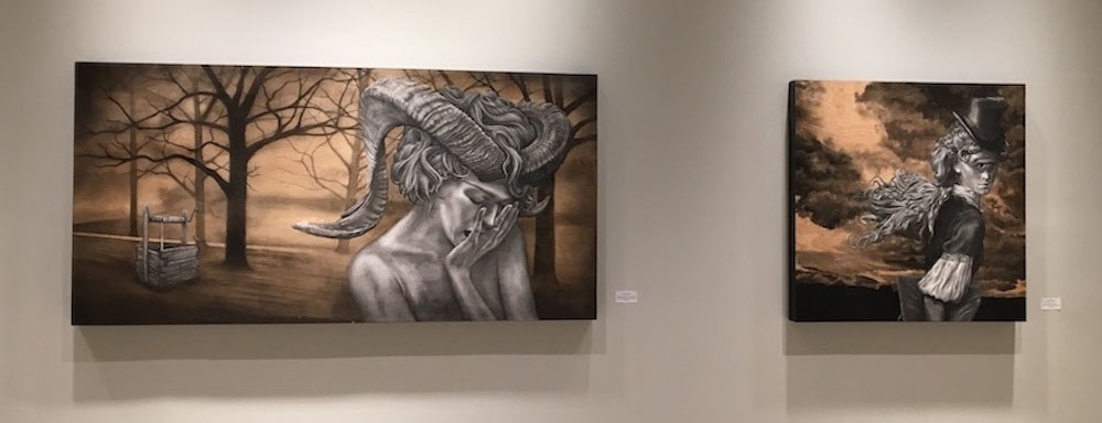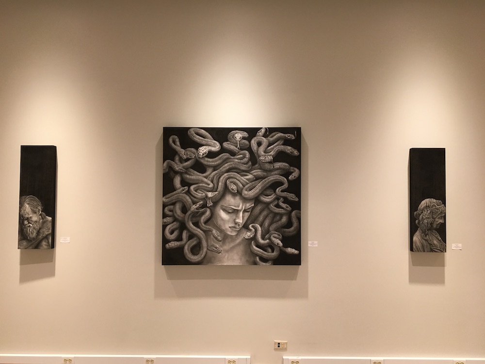 This exhibit featured graphite or charcoal drawings on wooden panels. His realistic drawings of unreal characters allow the audience a glimpse into secret moments of reflection, realization, loneliness, or despondency. Boles states: “Rendering detail is a form of meditation and focus for me. These characters’ personal stories become important to me as I consider their emotional reactions to a world where monsters show a capacity for humanity while humans show an aptitude for monstrosity.”