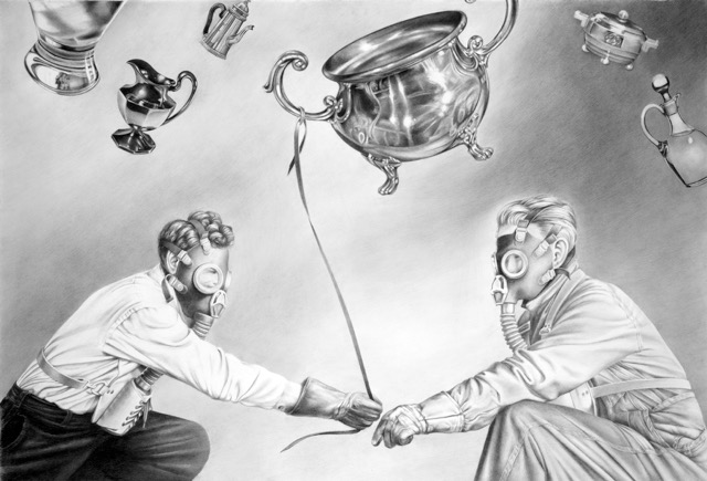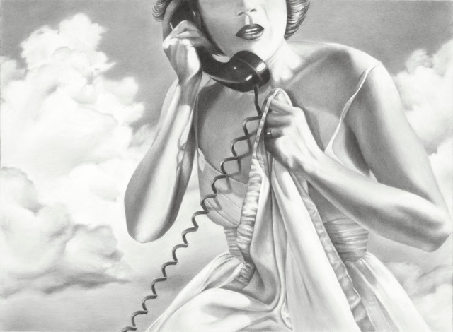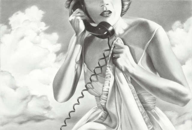 “My drawings typically include one or two figures involved in an improbable action or working at some curious task. Film Noir and magazines from the 1940’s and 1950’s often inspire my work. Growing up on the Great Plains, I often include the action of the wind in my work. Often the objects are beyond reach or curiously out of human scale to create a dreamlike atmosphere Subtle humor is often an important element in my work as well.”