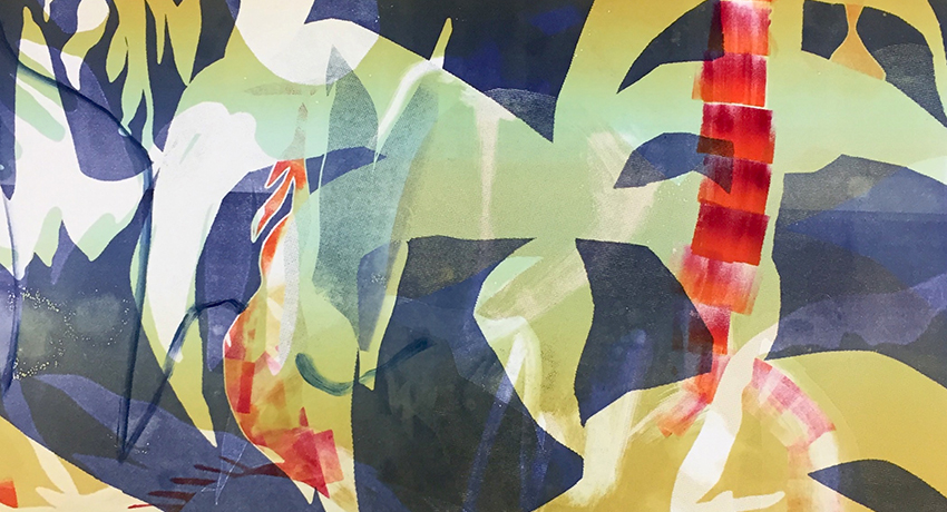 Dallas-based artist Jessie Barnes combines flora, fauna and human imagery in colorful, complex, and often jungle-like settings that harken back to her childhood in Florida. She practices printmaking, painting and drawing. Her work is currently on display at the Volunteer State Community College Art Gallery.