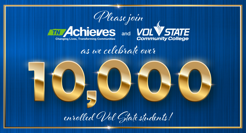 Please join us as Tennessee Achieves and Vol State celebrate a milestone as we've had over 10,000 Tennessee Promise students through our 8-year partnership! Current Tennessee Promise students who attend may receive a one-hour credit of community service!