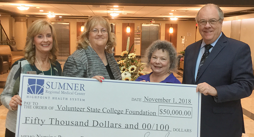 Sumner Regional Medical Center is the first of the area hospitals to commit support to the new Volunteer State Community College Nursing program, with a donation of $50,000. Vol State is taking the final steps to gain full approval for the new program. When final approval is received there will be an announcement about specifics. In the meantime, the Volunteer State College Foundation is seeking support for the startup costs. Pictured left to right: Karen Mitchell, executive director of the College Foundation; Susan Peach, market president, HighPoint Health System, and chief executive officer, Sumner Regional Medical Center; Linda Gibson, Vol State dean of Nursing; and Jerry Faulkner, Vol State president. For information about the Volunteer State College Foundation visit www.volstate.edu/foundation.