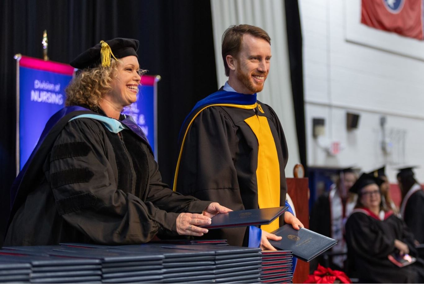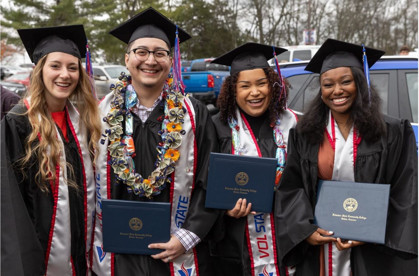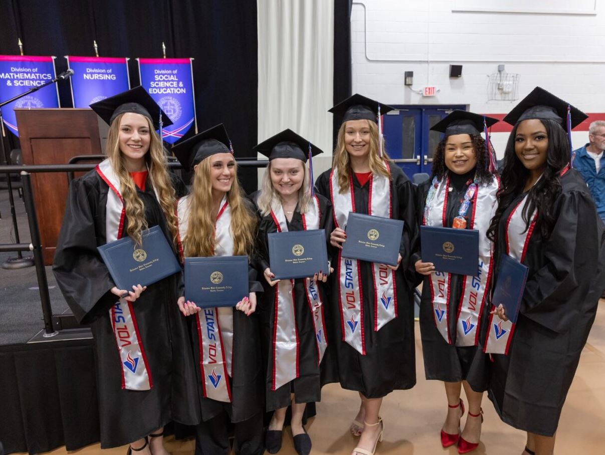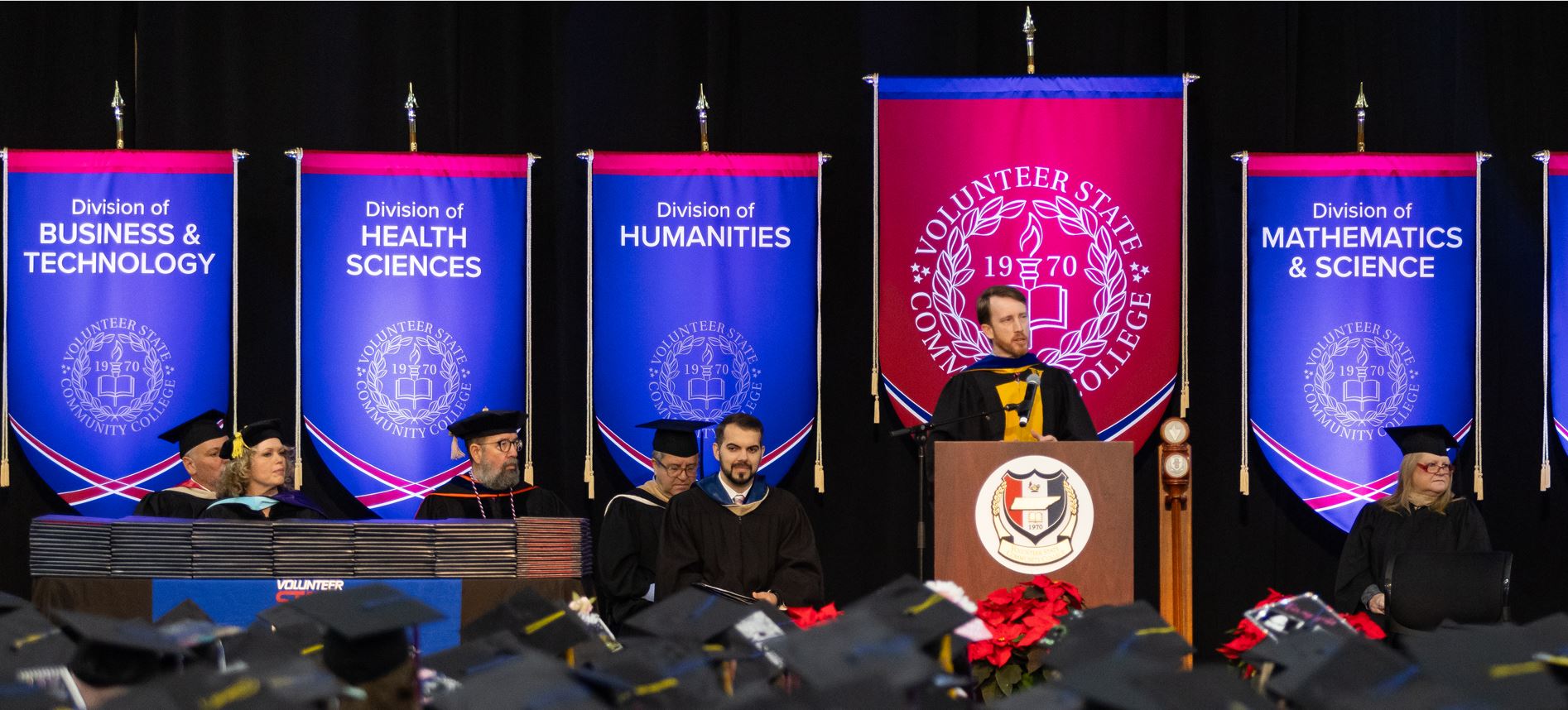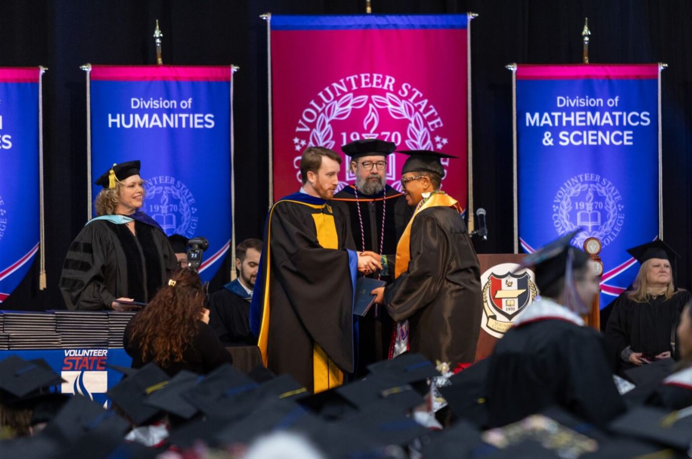 Vol State hosted a commencement to award graduates’ degrees today, December 9 at 10 a.m. at the Pickel Field House on the Gallatin, TN campus. In total, 435 graduates crossed the stage, marking the end of this part of their journey. The College also commemorated seven veteran students with a special coin given by Dr. Robert Denn from the Tennessee Board of Regents. Students participating had eleven different countries of birth and ranged in age from 18 to 68 years old.