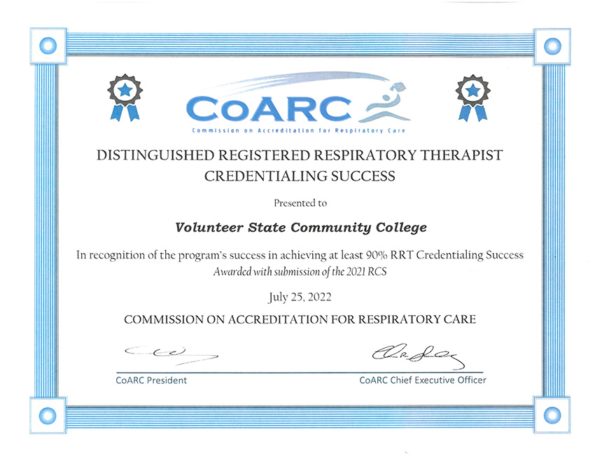 Gallatin, TN – Volunteer State Community College’s Respiratory Care Program received the Distinguished RRT Credentialing Success Award from the Commission on Accreditation for Respiratory Care (CoARC).